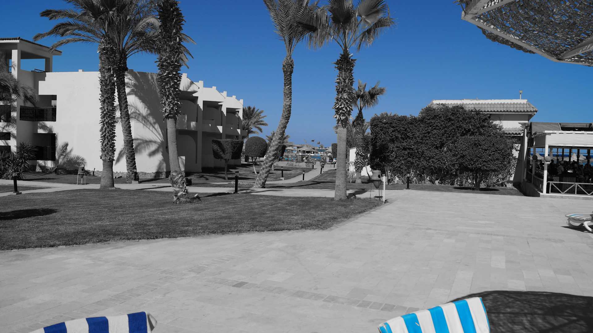 Blick vom Pool zum Garten mit Hotelanteil