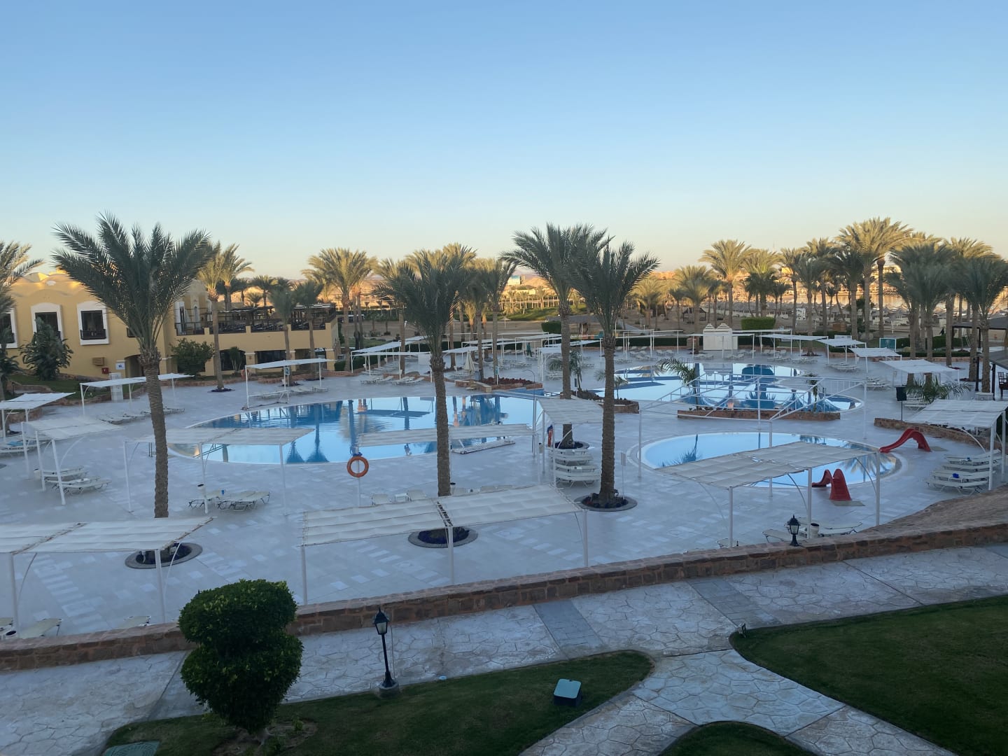 Poollandschaft vom Zimmer aus betrachtet