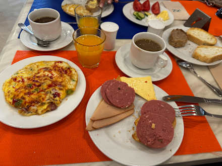 GastroFrühstück mit frischem Omelett und Spiegelei, frisch gepresster O-Saft, was will man mehr