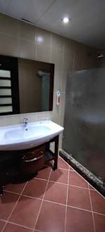 Zimmergroßes Waschbecken und begehbare Dusche mit Regenbrause und Wäscheleine
