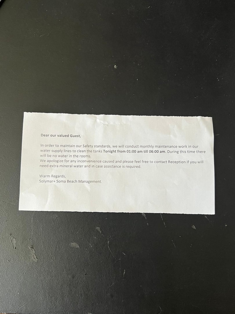 Das Info schreiben bezüglich Wasserabstellung . Die Mineralwasser Flaschen wurden erst Morgens um 8.30 Uhr in den WC Anlagen neben dem Frühstucks Saal hin gestellt weil das Wasser in der Gesamten Anlage immer noch nicht lief !