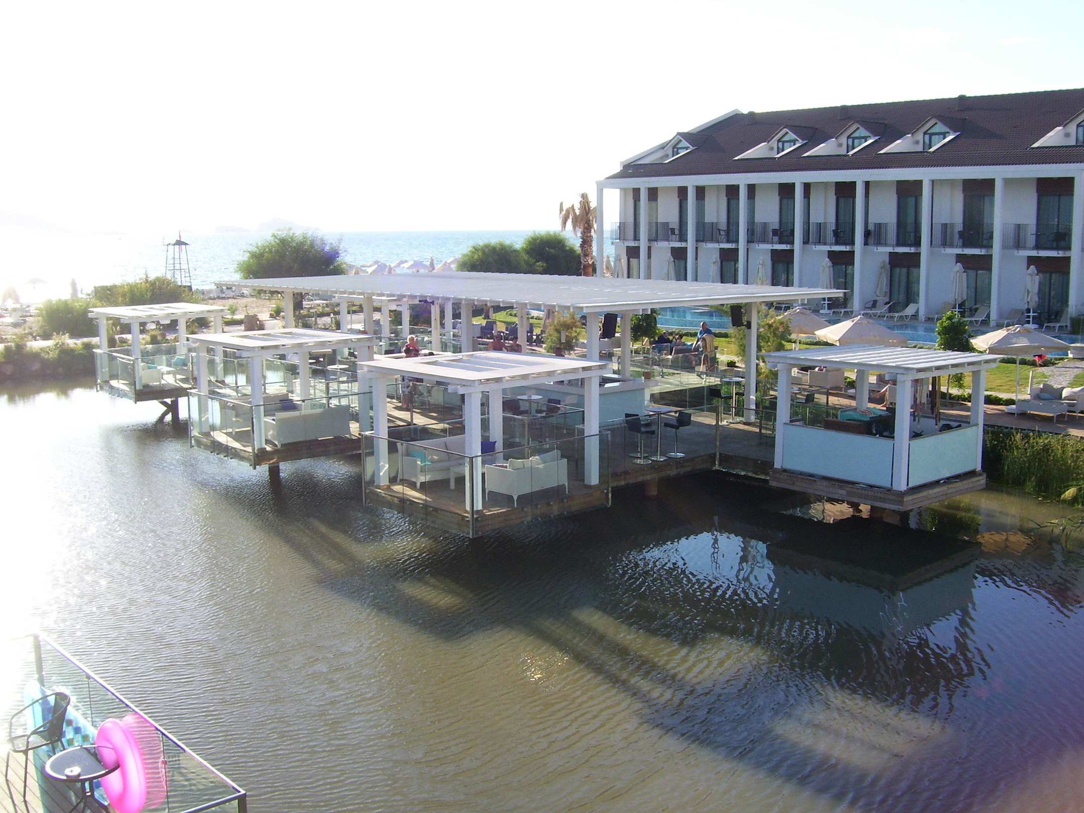 Gegenüb. Doppelzimmer, schwebende Bar, links Strand