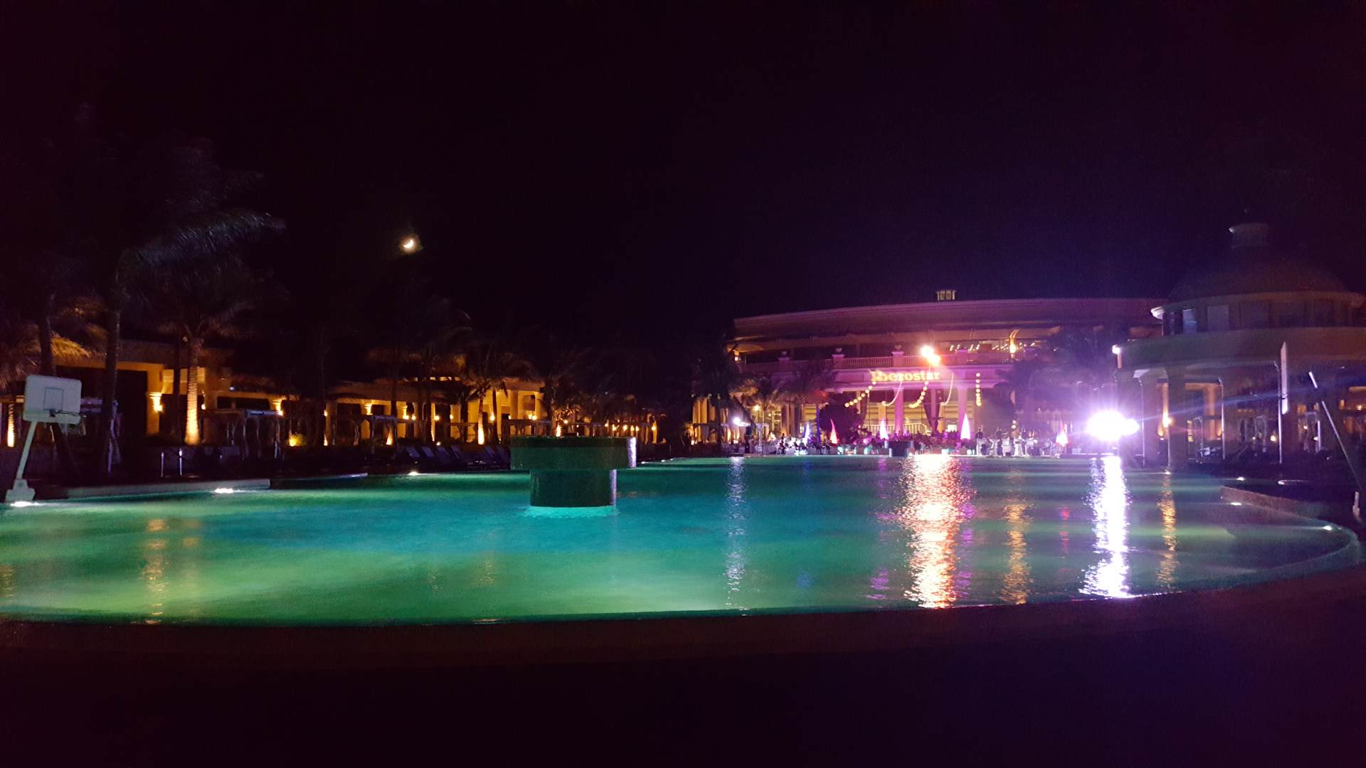Nächtliche Aufnahmen vom Pool in Richtung Buffetrestaurant