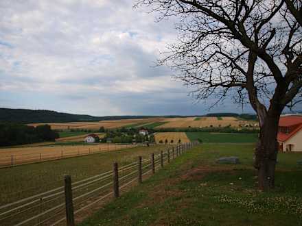 Aussicht vom Sommerhaus auf Korn und Sonnenblumenfelder