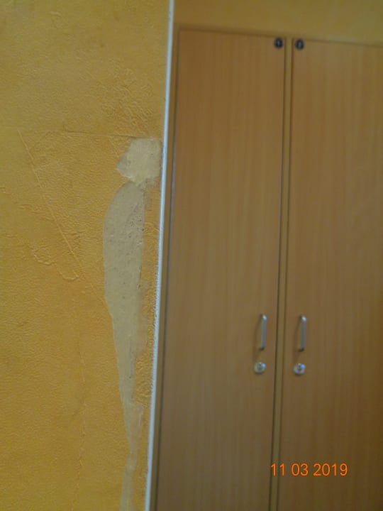 DJH Hamburg Stintfang, Wand vor Kleiderschrank, Tapete abgerissen.