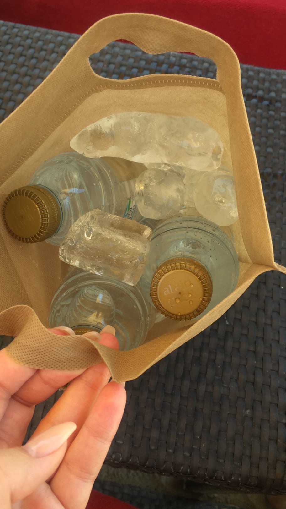 Mit Wasser wird man kostenlos versorgt in Eisbeuteln damit alles kühl bleibt.