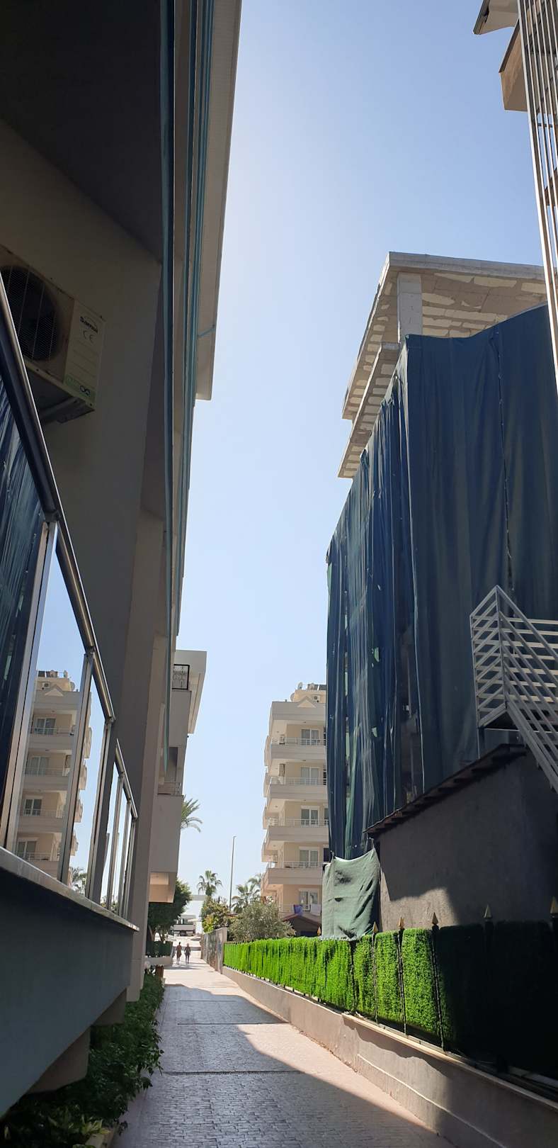 Rechts eine riesige Baustelle. Alles sehr eng und dreckig