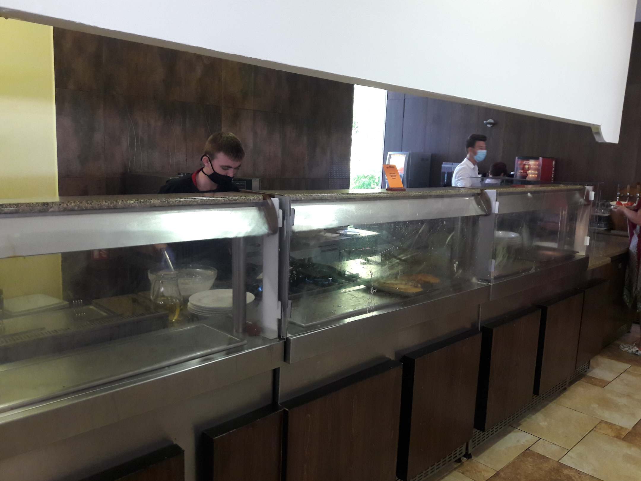 Heißes Büffet mit Sicherheitsvorkehrungen-keine Selbstbedienung-Speisen werden gereicht