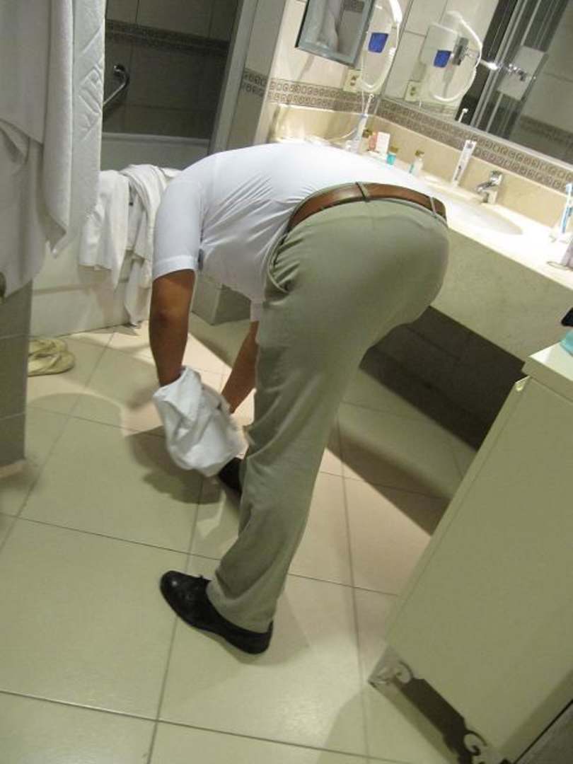 Kakerlakenbekämpfung Eine Servicekraft kommt mit Sprühflasche und Handtuch bewaffnet und sammelt mal wieder Kakerlaken ein.