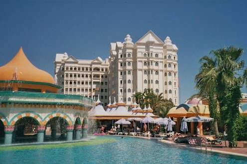 Hotel Fulya mit Wasserpool-BarVordergrund Wasserpool-Bar mit Sicht auf das Hotel Fulya im Hintergrund