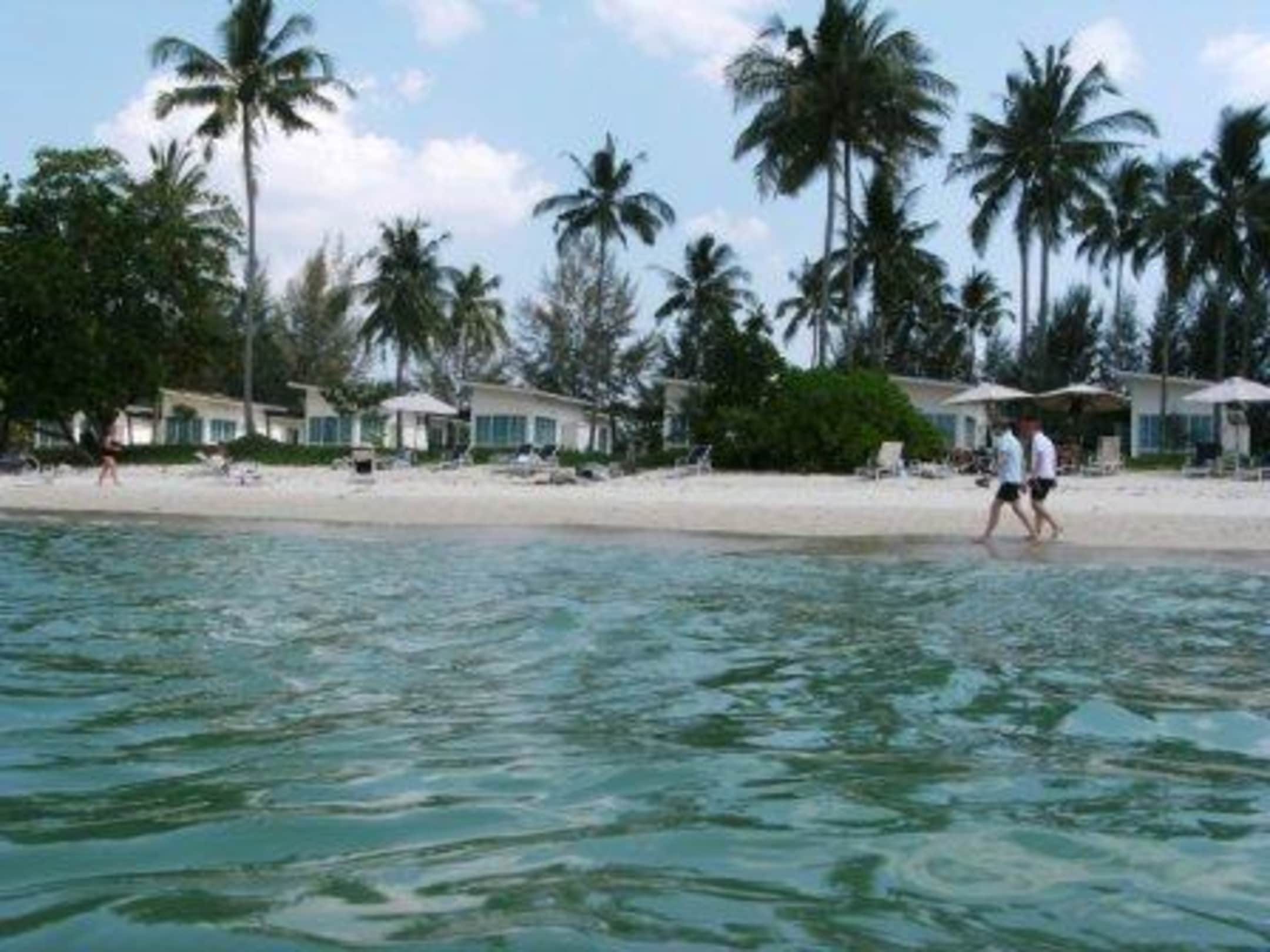 Blick vom Meer auf Strand und Villas