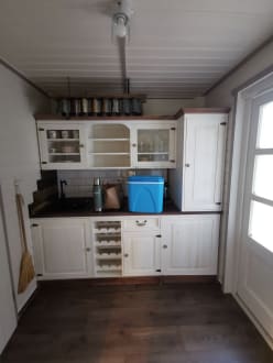 Küche mit Kochfeld und Kühlschrank