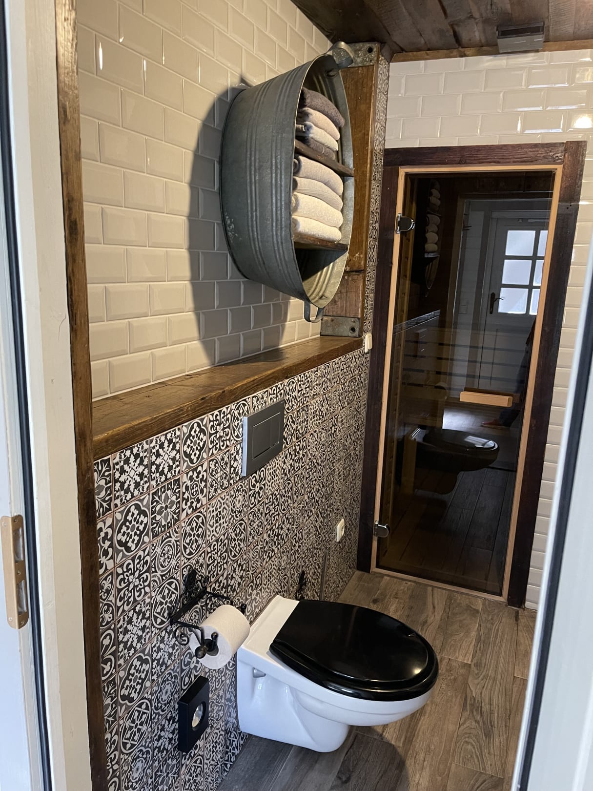 Bad mit Blick auf den Saunaeingang