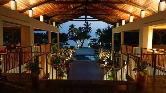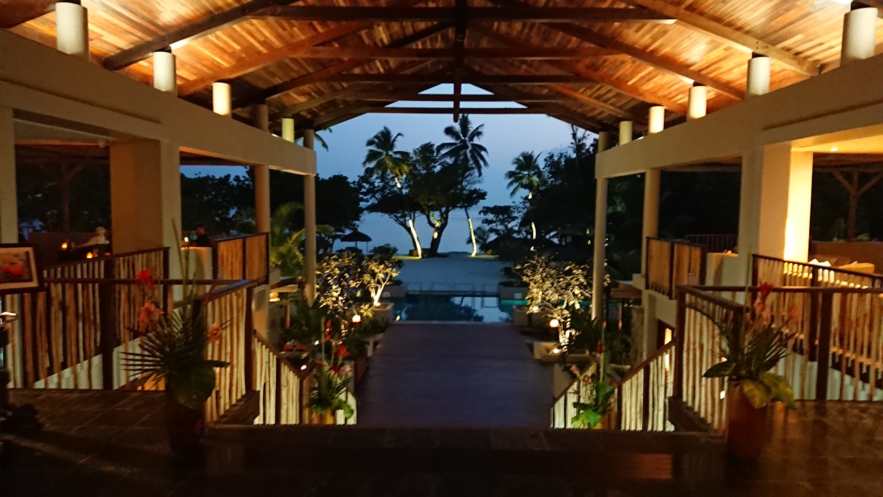 Ein abendlicher Blick aus der Lobby auf den Pool