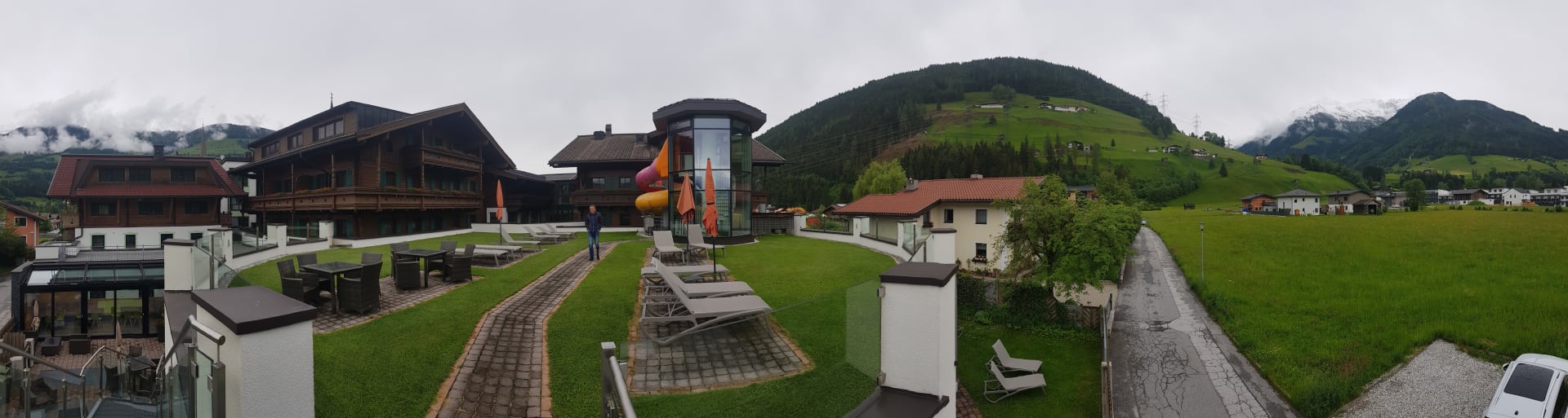 Panoramaansicht Biergarten, Rutsche und Dachterrasse