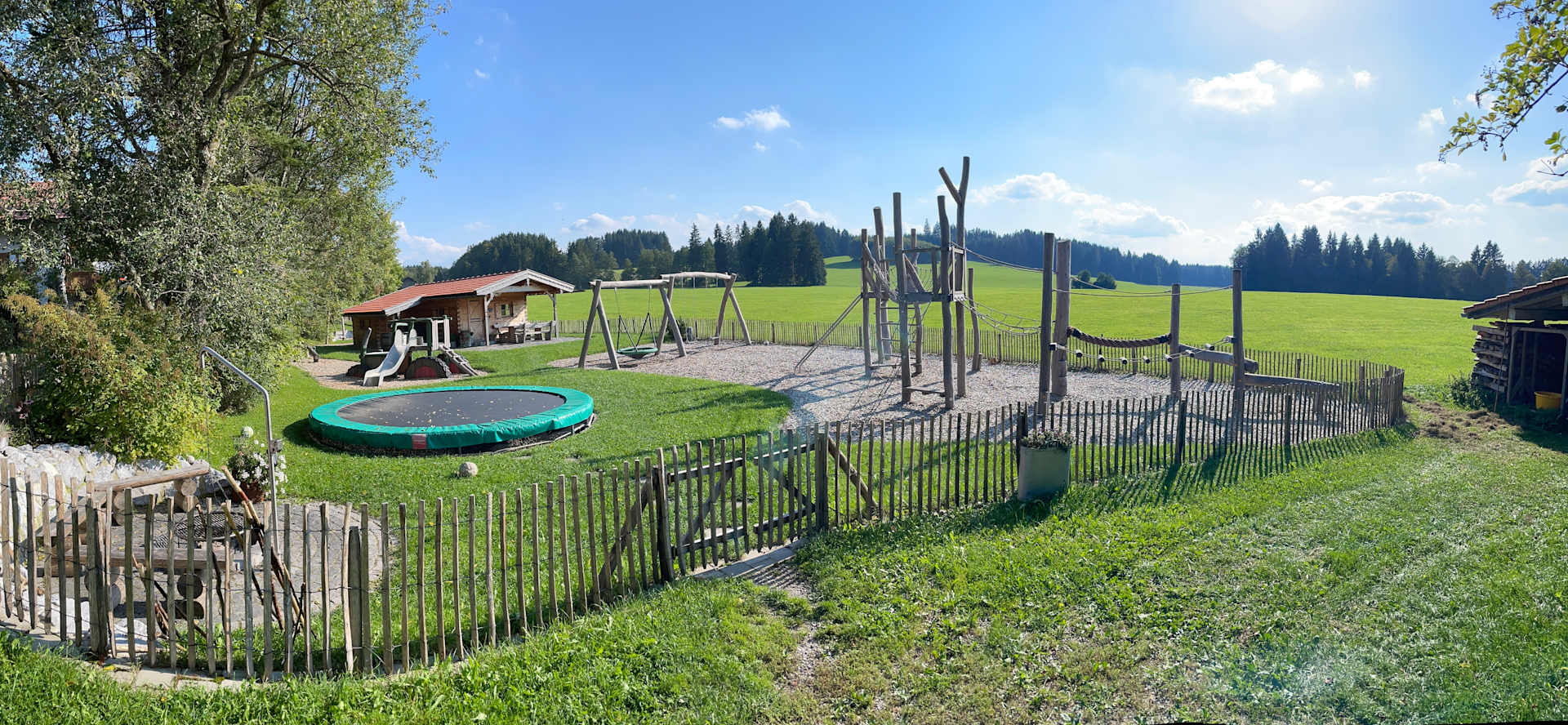 Spielplatz (vorderer Teil, Seilbahn, Sandkasten und Tischtennis hinter der Hütte)