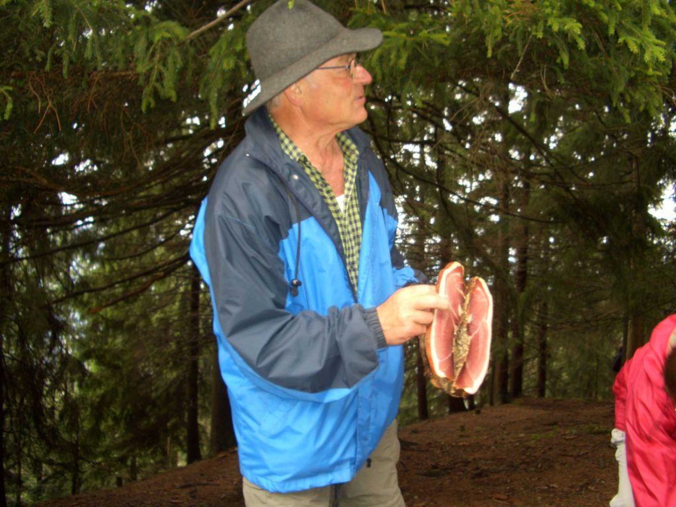 Vater Kaserer verteilt als Brotzeit Speck an die Hausgäste.
