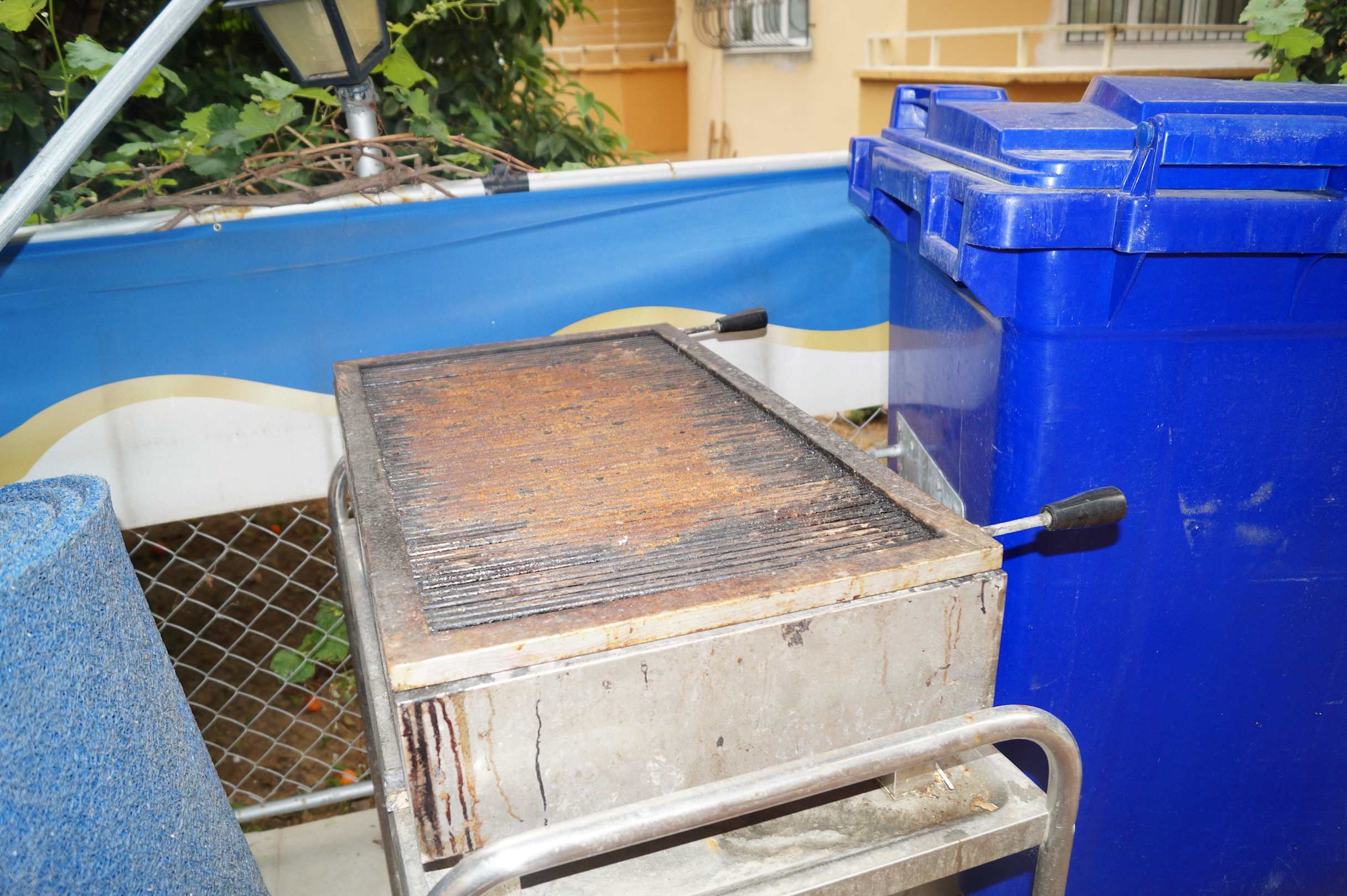 Dreckiger Rost zwischen Mülltonnen