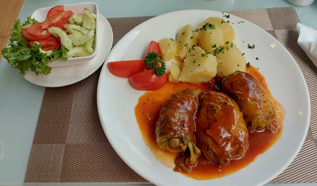 Kohlrouladen mit Salzkartoffeln und Salat.