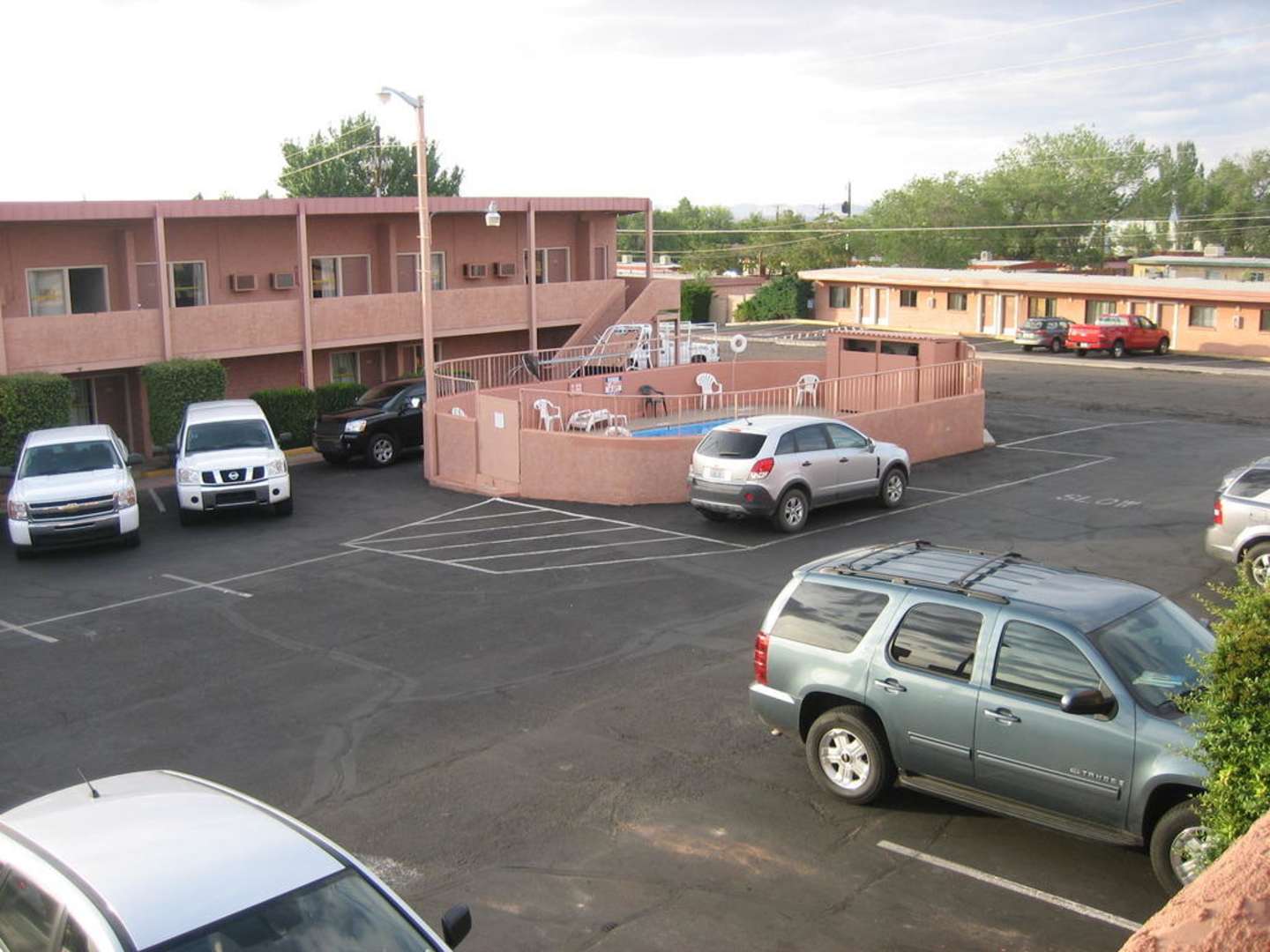 Außenansicht mit Parkplatz und Pool
