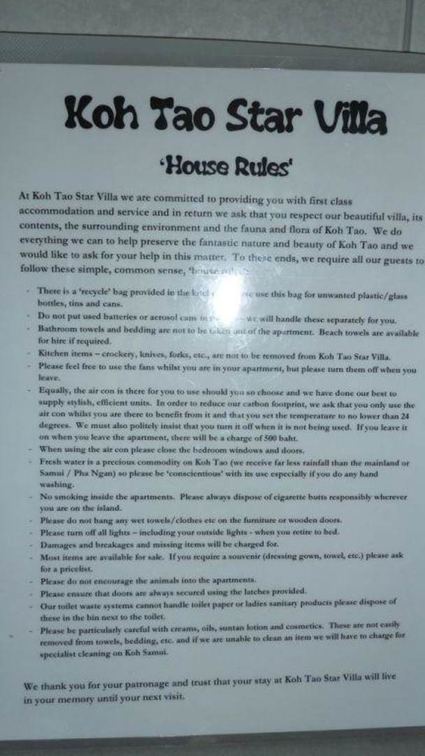 wer die klimaanlage vergißt auszuschalten muss 500 baht bezahlen. die restlichen "gesetze" wären ok wenn der zustand des hauses dem entsprechen würde