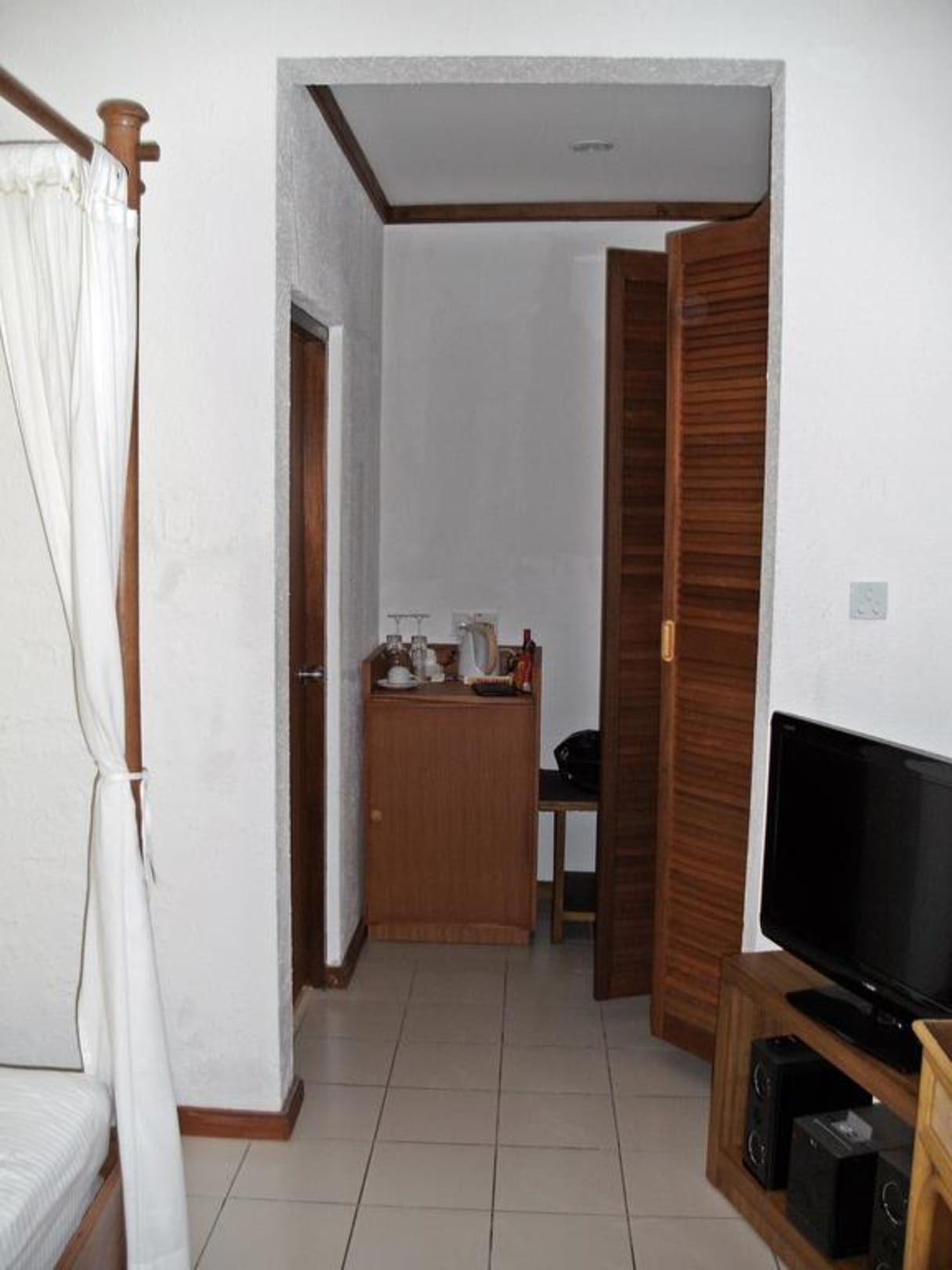 ZimmerBlick von der Eingangstür ins Zimmer, links ist das Doppelbett (kein Foto). Im Hintergrund: Fernseher, Stereoanlage, Schrank, Minibar.