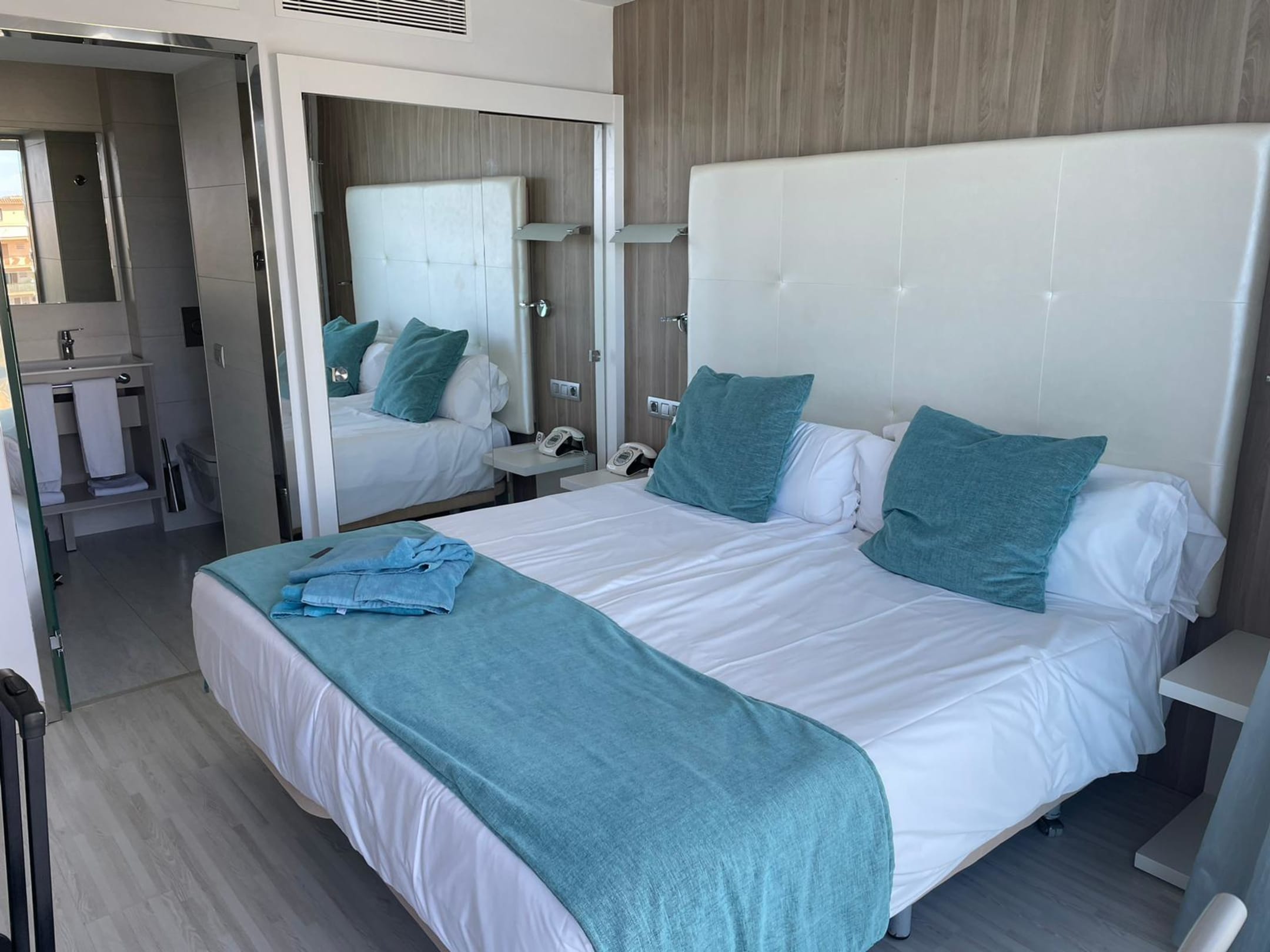 Bett und Blick auf Schrank und kleines Duschbad