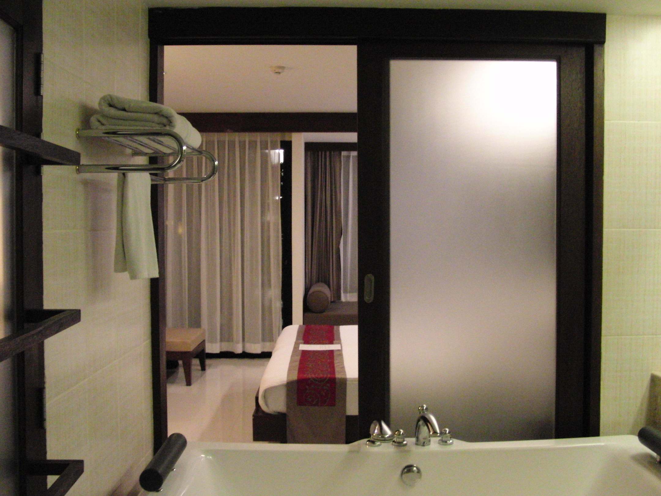Blick aus dem Bad ins Zimmer