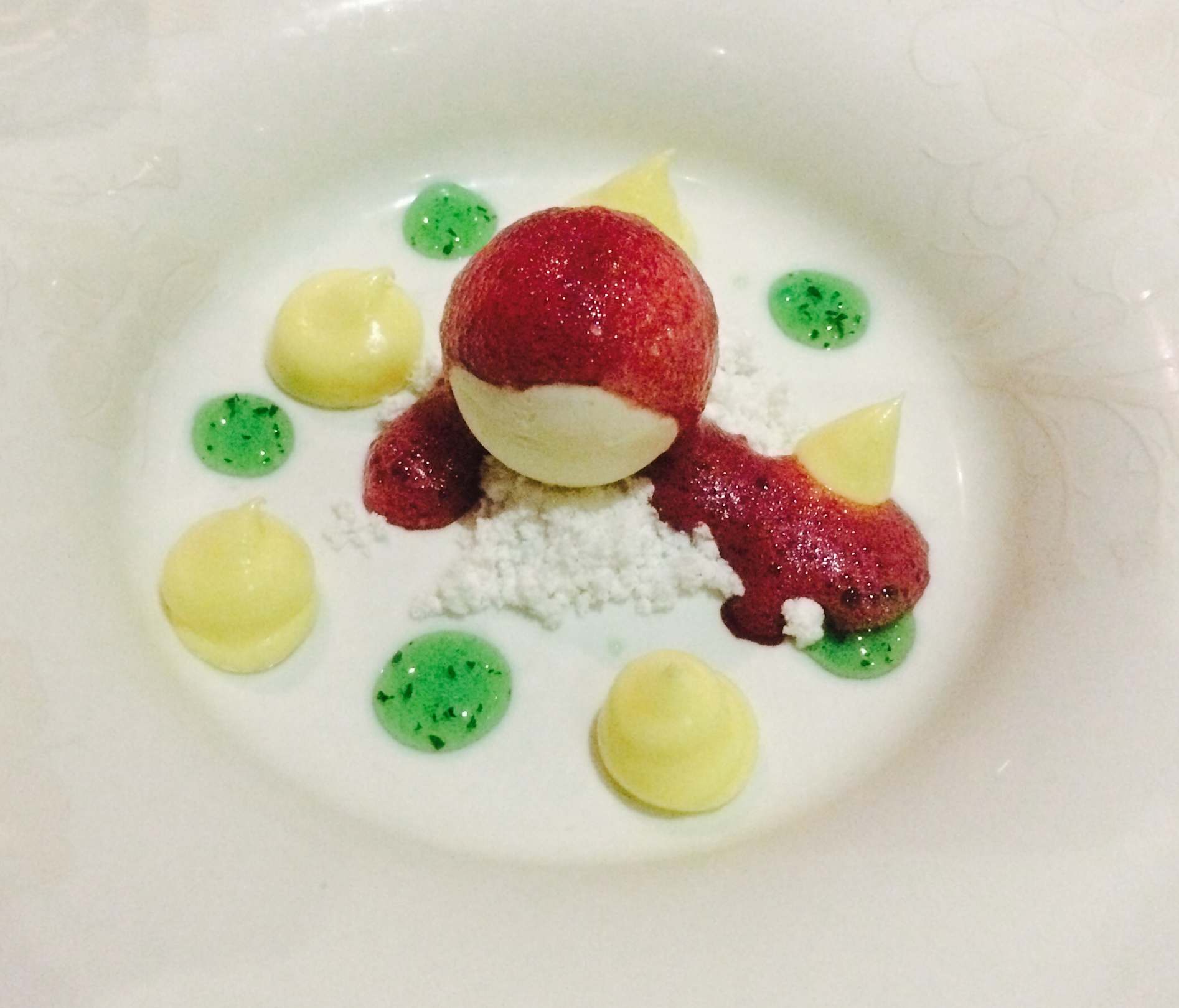RestaurantUnglaublich guter Nachtisch im französischen Restaurant L'Etoile: Joghurt Mousse mit Vanilletropfen und Basilikumschaum.
