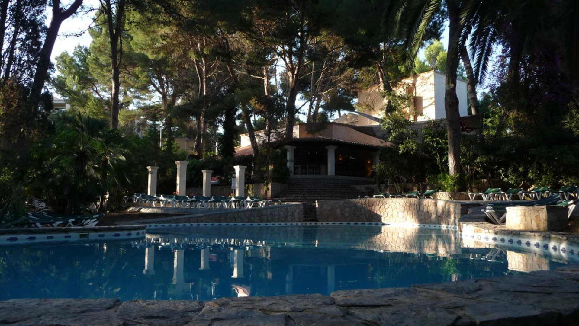 Blick über den Pool zur Bar