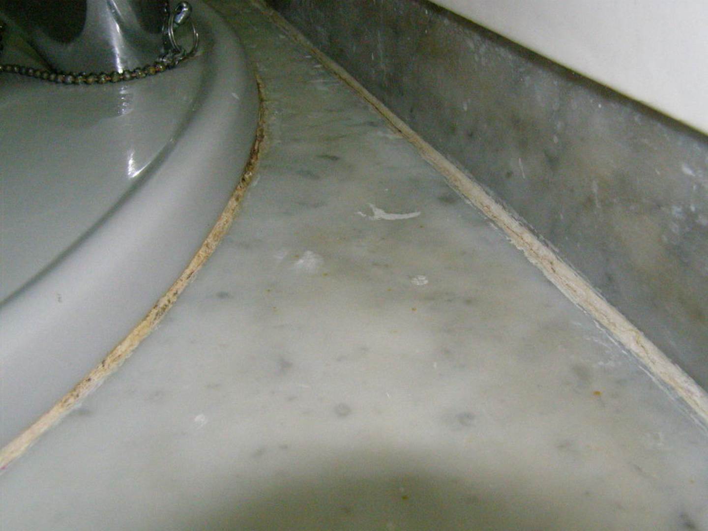 rundum am Waschbecken alte Farbe und Schimmel