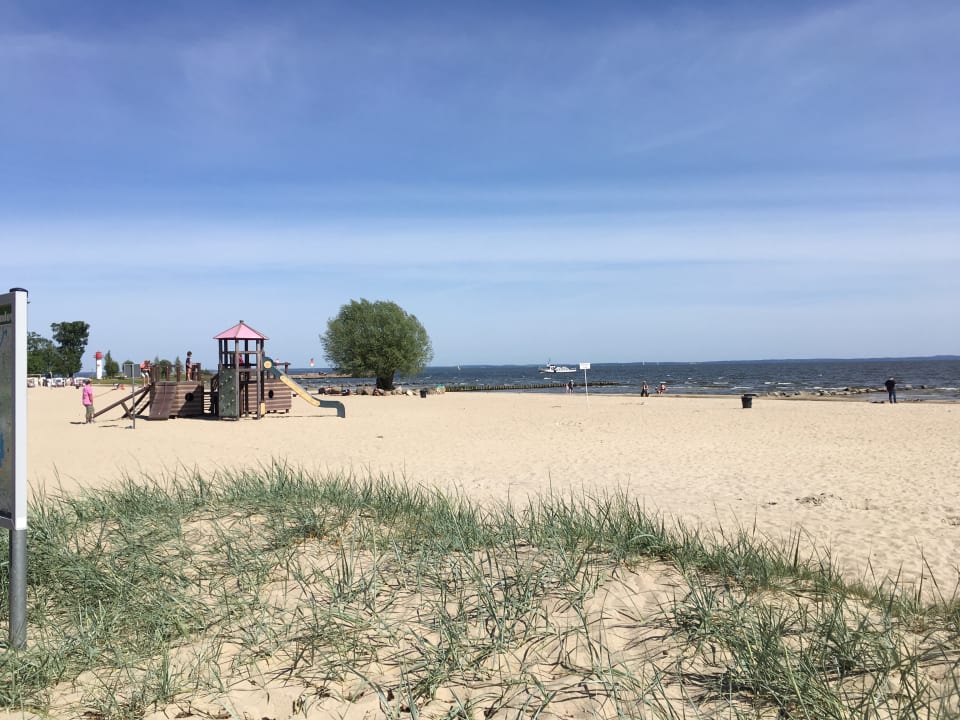 Strand mit schöner Kletteranlage und Rutsche.