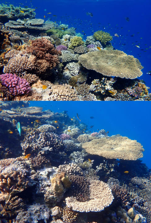 Aufgrund eines Sturms im März und estremen Meerestemperaturen von bis zu 36 Grad im Sommer 2023 haben die Riffe in nur wenigen Monaten sehr gelitten. Oben ein Riffabschnitt der "Isle" im Januar – unten Dezember.