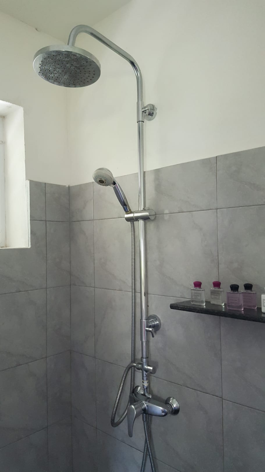 Grosszügige Dusche mit Shampoo, Duschgel und Conditioner