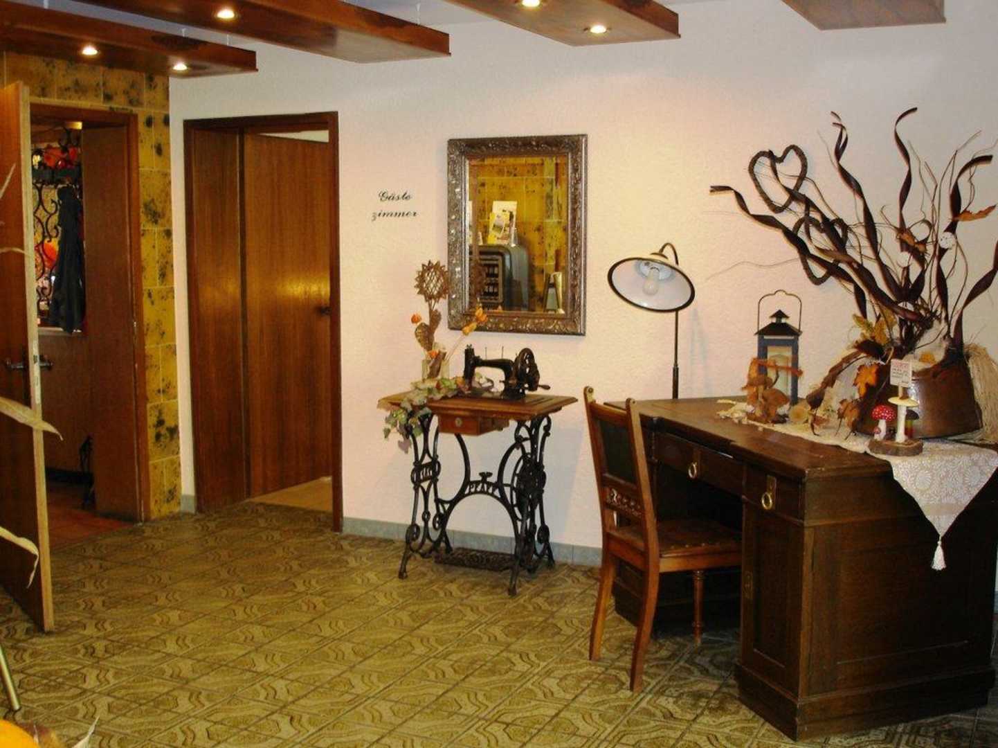 ein freundlich dekorierter Eingangsbereich mit dem Aufgang zu den Gästezimmern