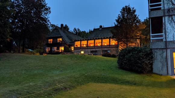 Blick zum Haupthaus mit beleuchteten Panoramarestaurant