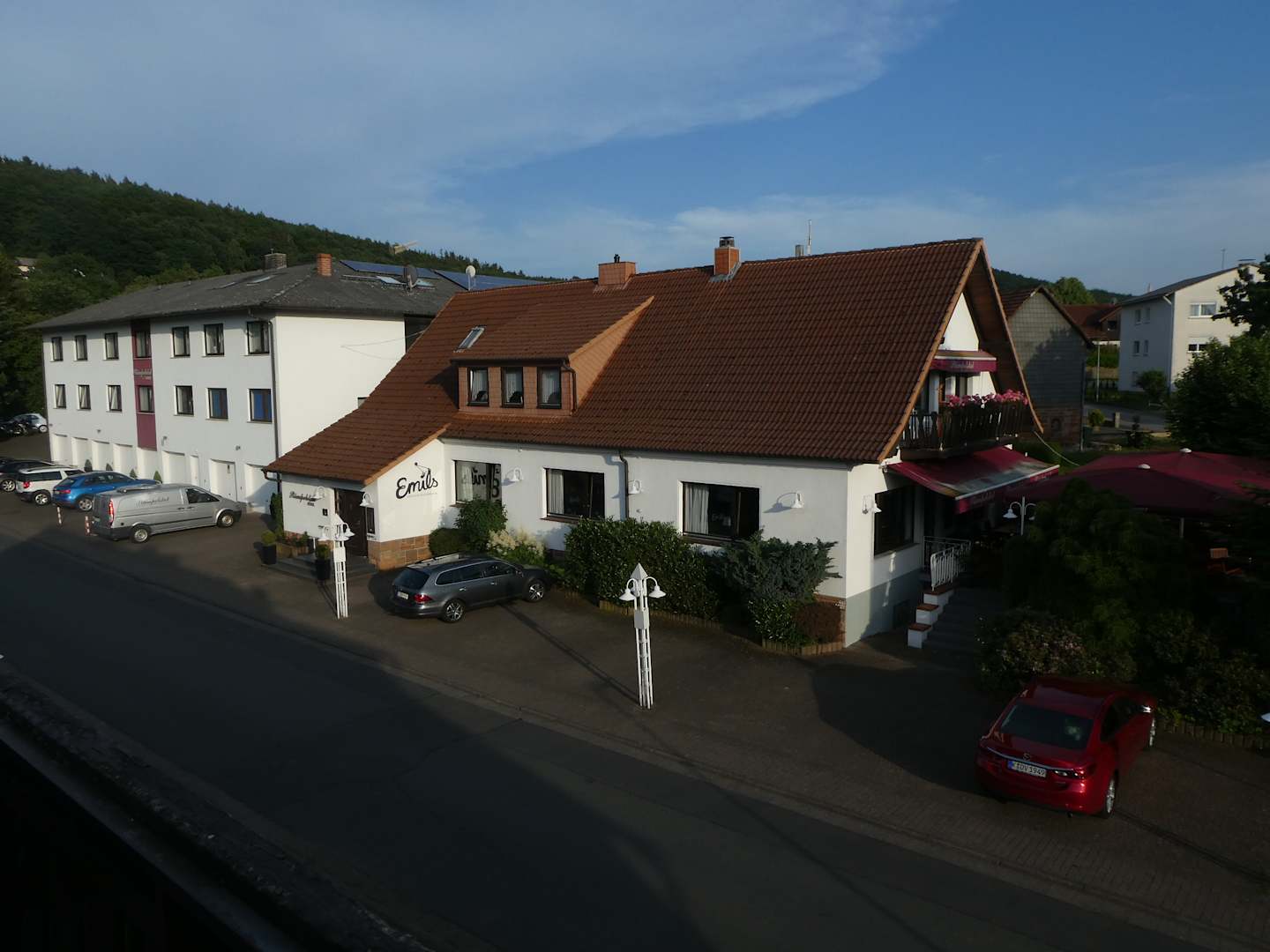 Ausblick von der Terrasse auf Restaurant und Hotel