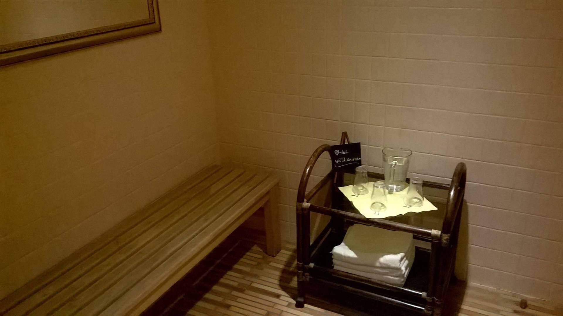 Trinkwasser und Handtücher bei Sauna