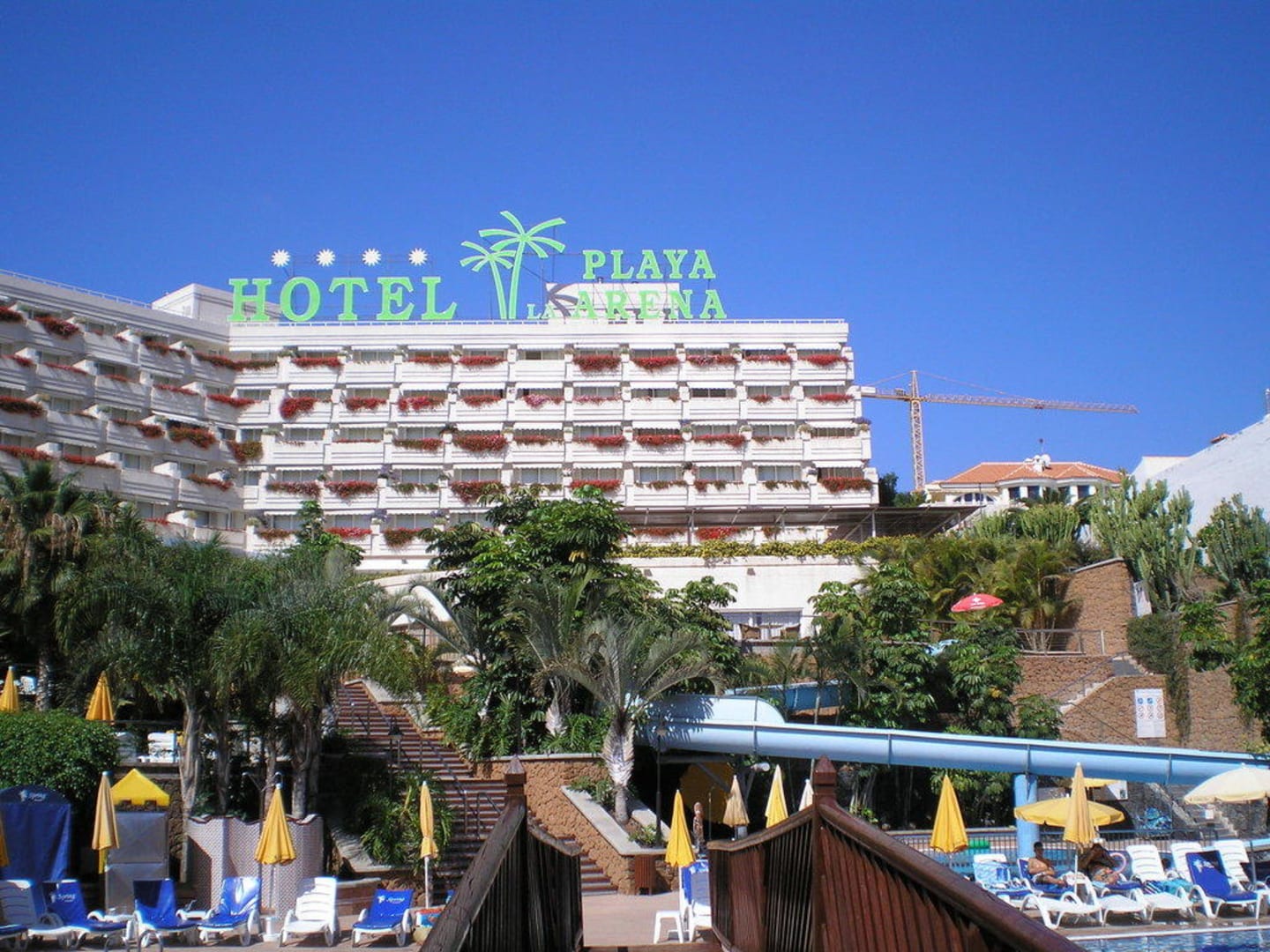 Blick auf das Hotel, die Wasserrutsche und die Gartenanlage