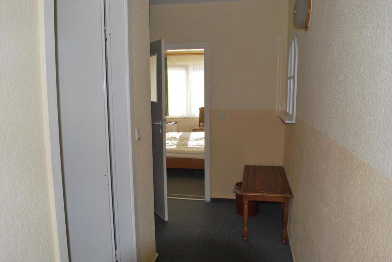 mit Spiegel (rechts). Vorne links Tür zum Bad, hinter Tür (Bildmitte) Kleiderschrank.