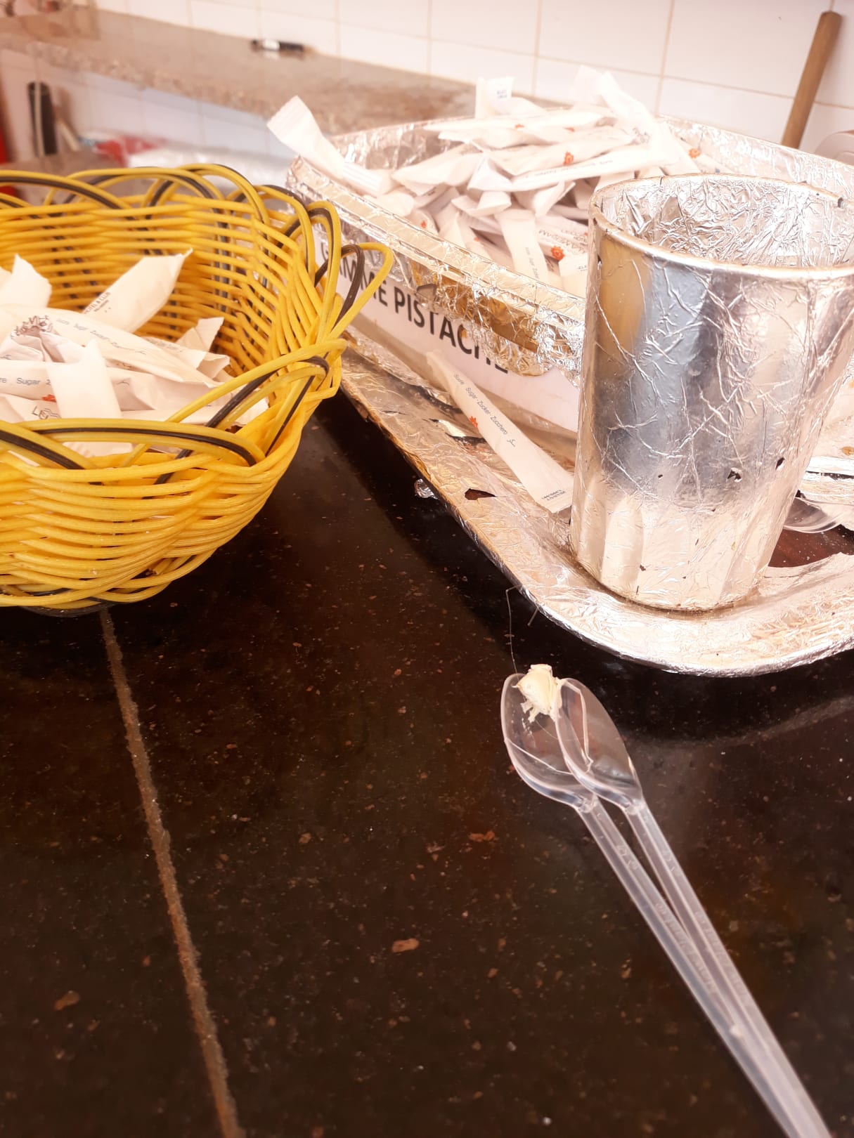 die Selbstbedienung beim Kaffeeautomaten ,keine Becher,keine Löffel