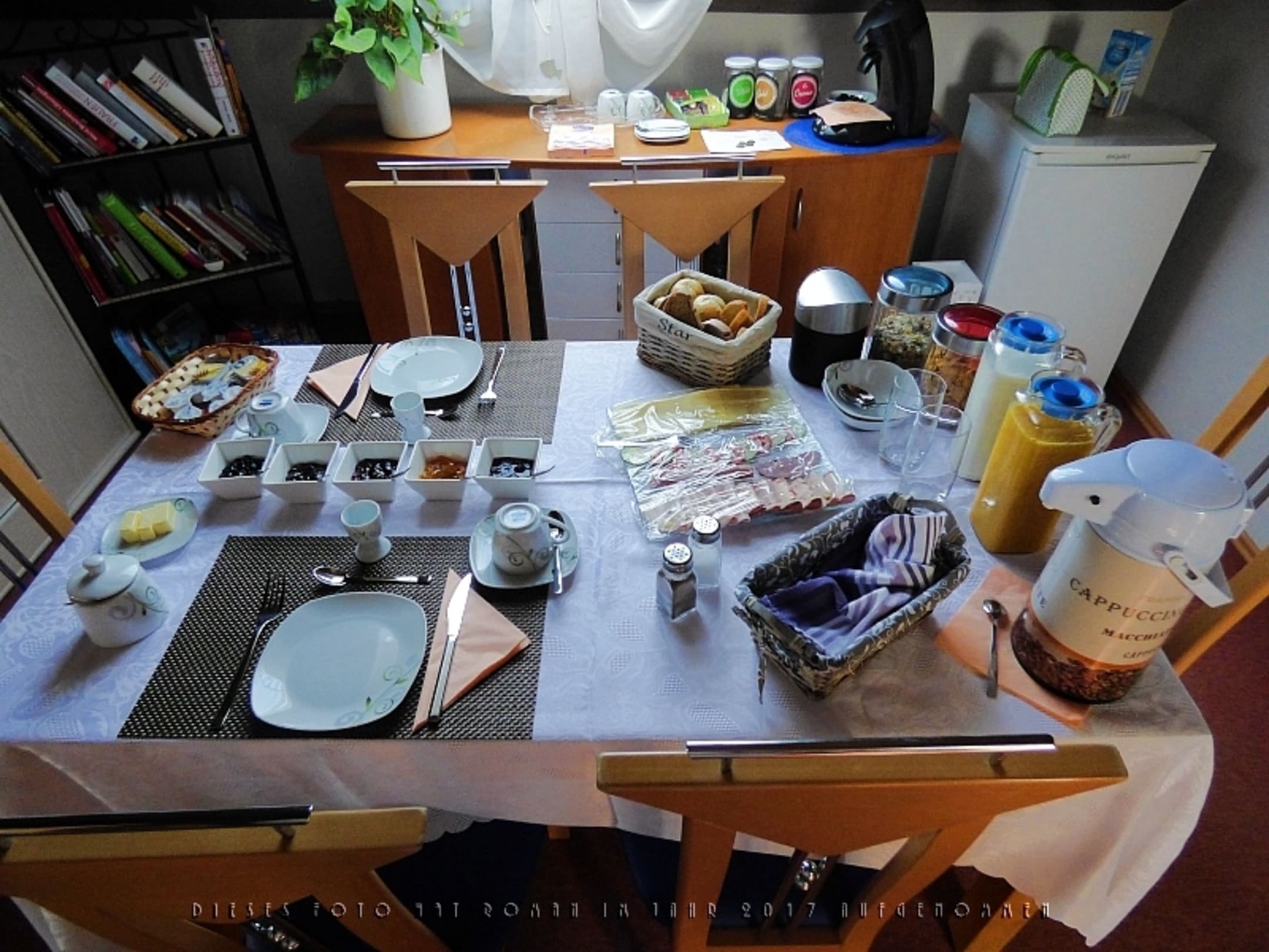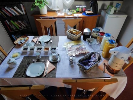 Der gedeckte Frühstückstisch für zwei Personen, mit Sitzgelegenheiten für insgesamt sechs Personen. Dieser Raum ist die Diele im Dachgeschoss, über den man zu beiden Zimmern, zum Bad und zur Treppe hinab zur Haustür gelangt.