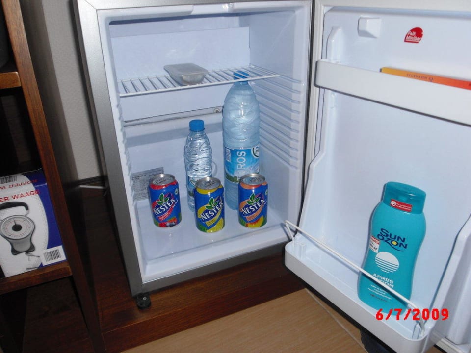 Minibar wird täglich mit 3 Dosen Eistee und 2 Flaschen Wasser gefüllt.