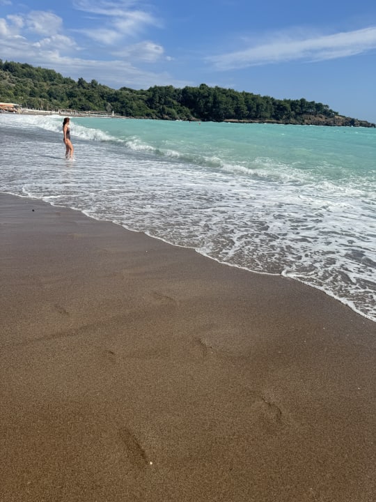 Beim Reingehen ins Wasser Sandstrand, danach kommen die Kieselsteine.