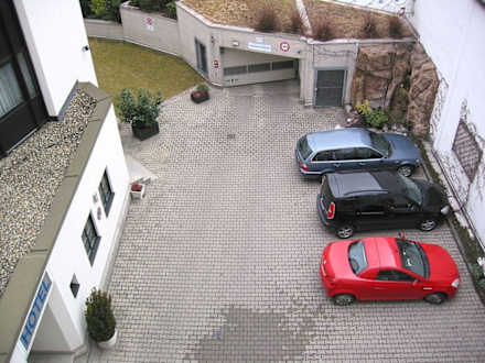 Hotel MayerhofBlick auf den Innenhof des Hotels mit einigen Parkplätzen und der Einfahrt in die Tiefgarage, die unter dem Anbau (ganz links) ist.