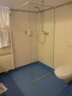 Dusche im Badezimmer ist nur zum WC hin mit einer Glaswand getrennt. Nach vorne hin ist kein Schutz, nur eine Neigung im Boden. "Land unter" im halben Bad pro Duschgang.