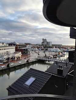 Zimmerausblick Richtung Hafen, im Vordergrund die Dächer der Miniappartments