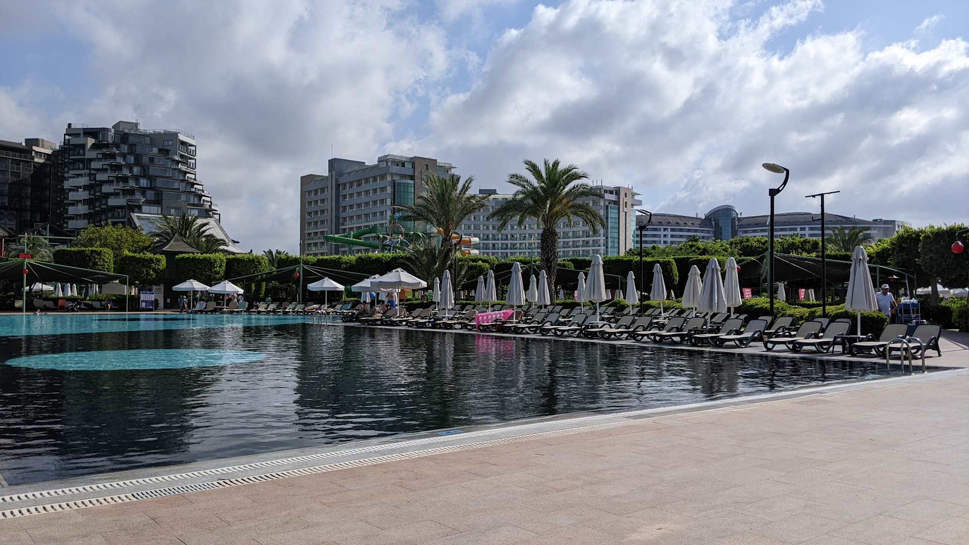 Im Vordergrund der Hauptpool mit Musik & Animation. Links das Limak Lara Deluxe, mittig im Bild das Nachbarhotel Sherwood. Ganz hinten rechts das Royal Wings.