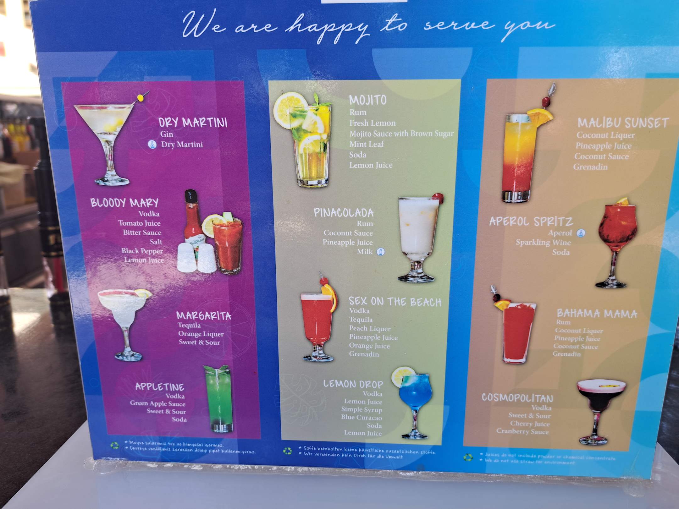 Ich empfehle Mojito und Bahama Mama