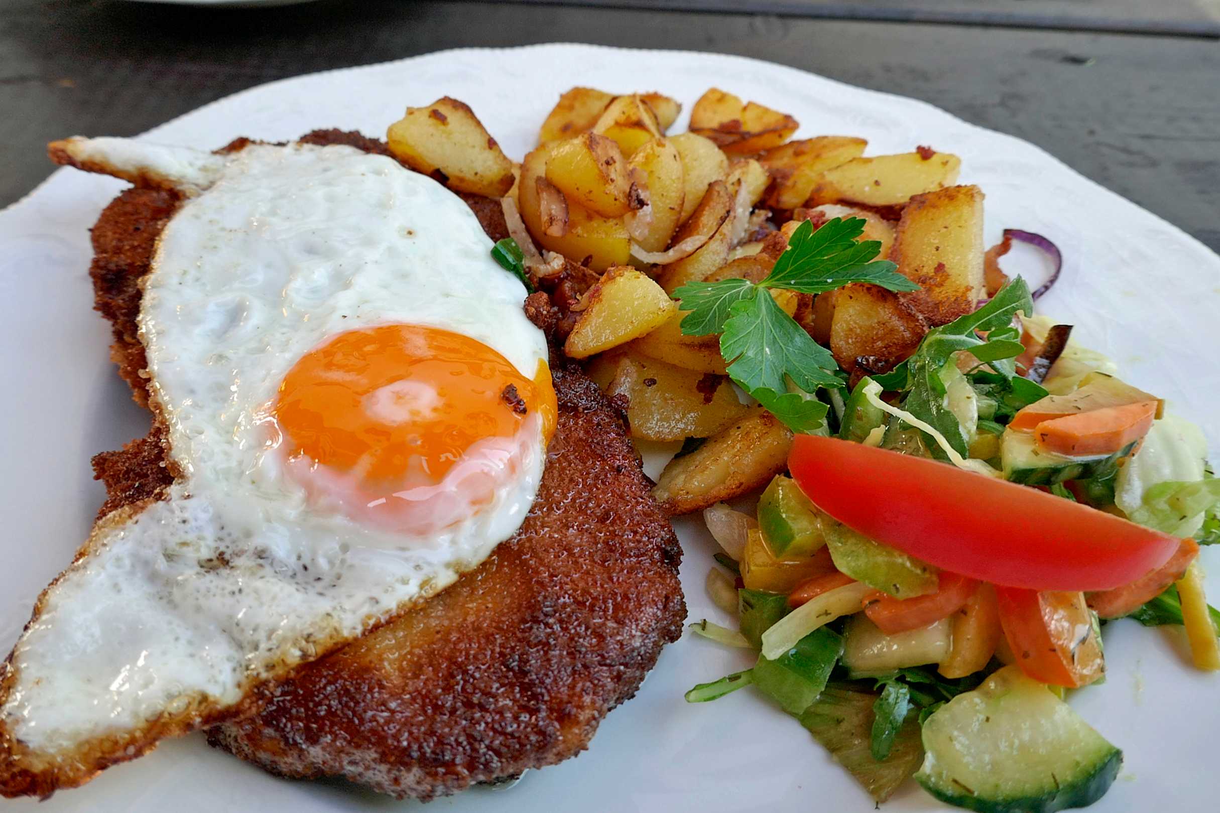 Schweineschnitzel mit Bratkartoffeln und Spiegelei